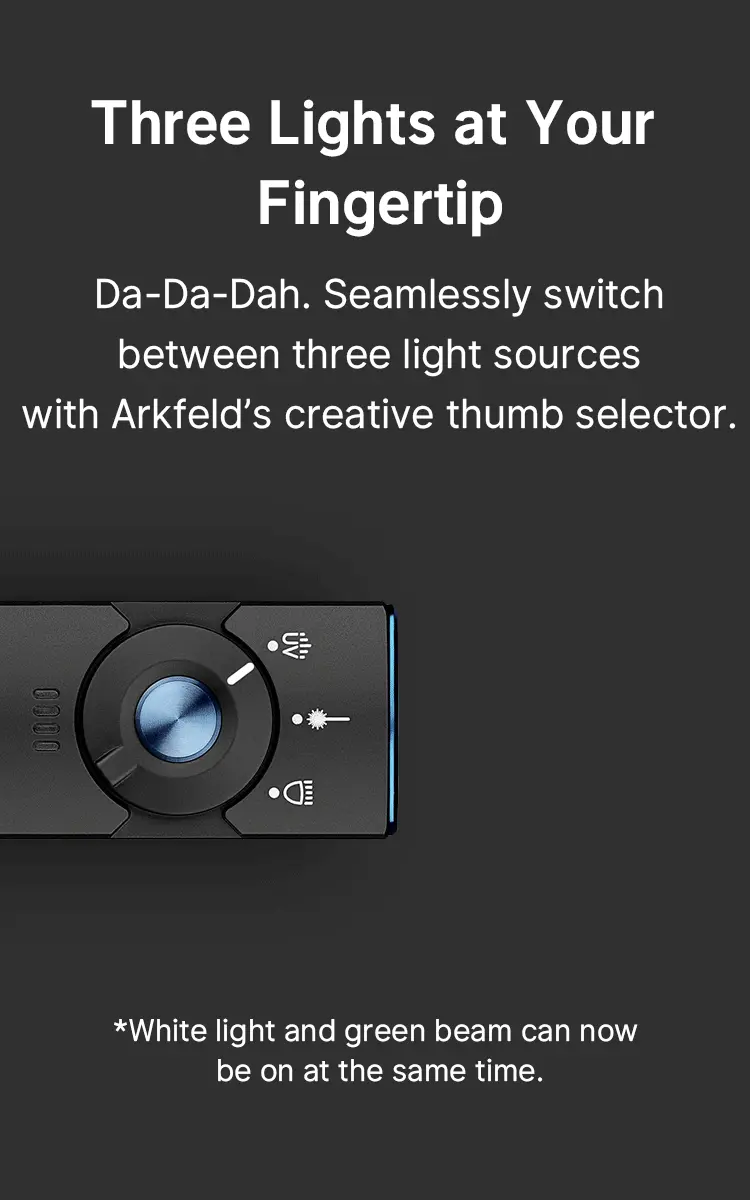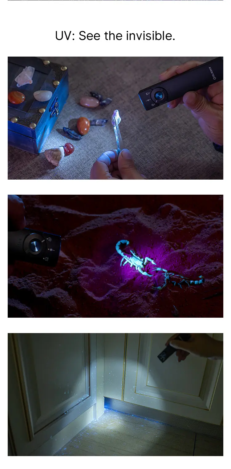 ● Versatile 3-in-1 EDC: Olight's FIRST rechargeable flashlight that combines 1,300lm white light, 900mW UV light, and Class 3R green laser, offering versatility for a wide range of applications.